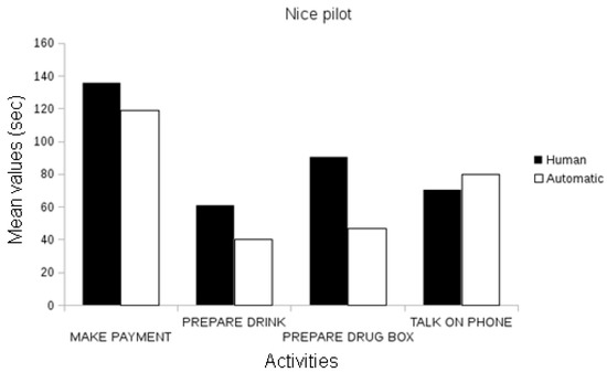 In a nutshell, in this cross-pilot evaluation, we firstly demonstrated that the CAR system provides activity recognition data for the analyses of the performance of pilot participants’ IADL activities. Therefore, the proposed system enables the objective assessment of patient performance data with relatively less effort than the manual annotation of activities by human experts without the common observer biases. Secondly, we observed that certain activities and derived parameters may discriminate participants from certain groups of cognitive status (make payment event), but no parameter can discriminate all cognitive classes. In this sense, as discussed in [10,27], more sophisticated models are necessary to model the differences between the cognitive status classes (healthy participants versus MCI; and MCI participants versus Alzheimer’s participants) and support clinicians by providing them with an objective assessment regarding the patient’s cognitive status.