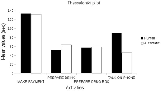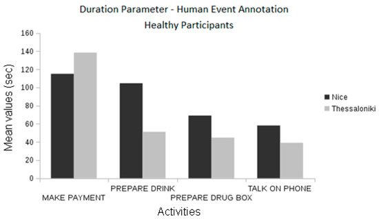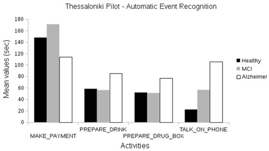 In the Thessaloniki pilot, when analyzing events manually annotated by human experts, we observed differences between the duration of activities among cognitive classes for the “talk on the telephone” event between the healthy and Alzheimer groups and the healthy and MCI groups (one-way ANOVA, p < 0.01). Differences in the duration of “make payment” events were also observed between the healthy and Alzheimer participants and MCI and Alzheimer participants (one-way ANOVA, p < 0.01; see Figure 10).