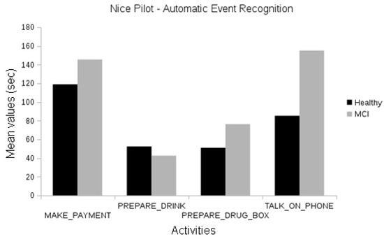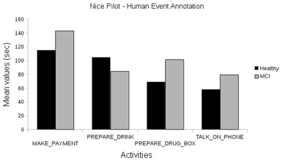 In the Nice pilot, no statistically significant differences were found between the MCI and the healthy participants, neither using human annotations of events (Figure 8) nor automatically recognized events (Figure 9). Since this evaluation focused on the short version of the laboratory protocol, there were not enough participants for a significant comparison between the Alzheimer’s group and the others.