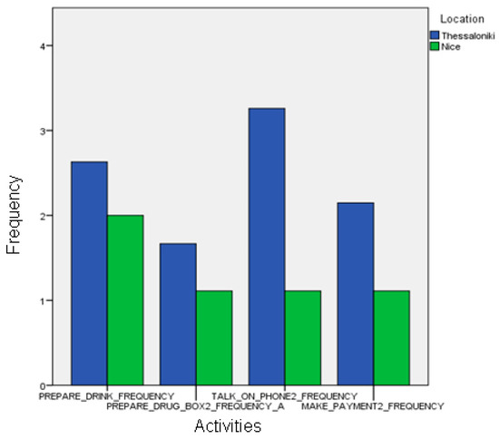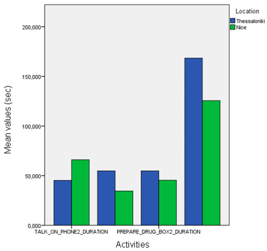 In the third evaluation, we sought for differences between the activities of patients of different pilot sites (Nice, Thessaloniki) but same cognitive status (HC, MCI). For instance, would the healthy groups be different (in duration and frequency of activities) between the Nice and Thessaloniki pilot participants? We compared the Nice and Thessaloniki participants using the four usual instrumental activities of daily living with manually annotated IADL and the automatic recognition of IADL and gait-related events.