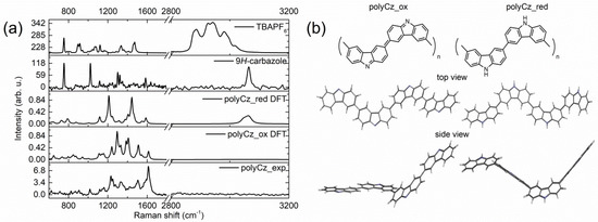 Raman spectra and proposed structures of polyCz: (a) Raman spectra of the prepared polyCz, theoretical spectra of the oxidized, reduced forms of polyCz, starting 9H-carbazole and TBAPF6 as the supporting electrolyte, respectively; (b) proposed structures of the oxidized (polyCz_ox) and reduced (polyCz_red) forms.