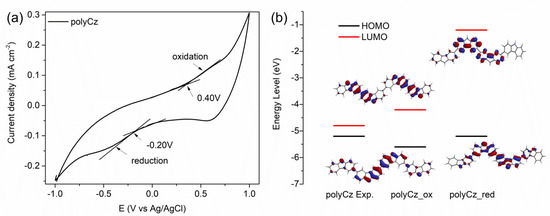Comparison experimental and theoretical energy levels of polyCz: (a) cyclic voltammogram of the polyCz electrode in 0.1 M phosphate-buffered saline solution (PBS) (pH 7.4) at sweep rate of 50 mV·s−1; (b) experimental and theoretical energy levels and visualization of their orbitals (isovalue = 0.032) of polyCz.