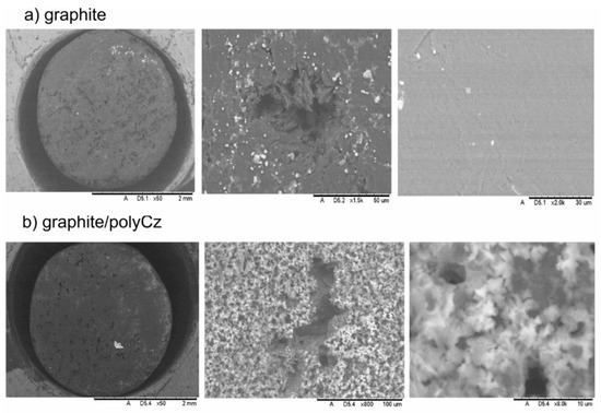 Scanning electron microscopy images of surfaces of (a) bare graphite; (b) graphite/polyCz electrodes are presented. Scales are 2 mm, 50 μm, 30 μm, 2 mm, 100 μm, and 10 μm, respectively.