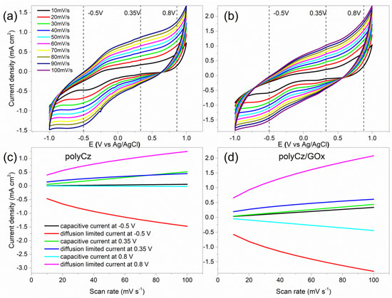 Cyclic voltammograms of (a) the polyCz and (b) polyCz/GOx electrodes in 0.1 M PBS (pH 7.4) at different sweep rates; calculated current densities of faradaic and pseudocapacitive processes at −0.5, 0.35, 0.8 V vs. Ag/AgCl on (c) the polyCz and (d) polyCz/GOx electrodes.