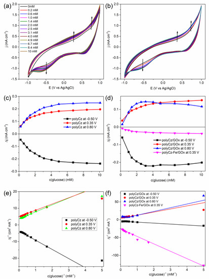Current density responses for the non-enzymatic (polyCz) and enzymatic (polyCz/GOx and polyCz-Fe/GOx) electrodes under varying glucose concentration: (a) cyclic voltammetries (CVs) for the polyCz and (b) polyCz/GOx electrodes; (c) current densities response on the concentration of glucose in solution at pH 7.4 at −0.5, 0.35, 0.80 V vs. Ag/AgCl for polyCz and (d) polyCz(-Fe)/GOx (d); (e) the Lineweaver–Burk linearity test for polyCz and (f) polyCz(-Fe)/GOx.