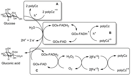 Possible glucose sensing mechanisms: A-direct glucose oxidation on the electrode; B-direct hole transfer between GOx-FAD and polyCz; C-H2O2-based mechanism on the poly-Fe/GOx electrode.