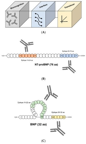 Detection of B-type natriuretic peptide. (A) Point-of-care biosensor platform; (B) N-terminal pro-B-type natriuretic peptide (NT-proBNP) epitopes (13–24 aa and 63–76 aa); (C) B-type natriuretic peptide (BNP) epitopes (11–22 aa and 26–32 aa).