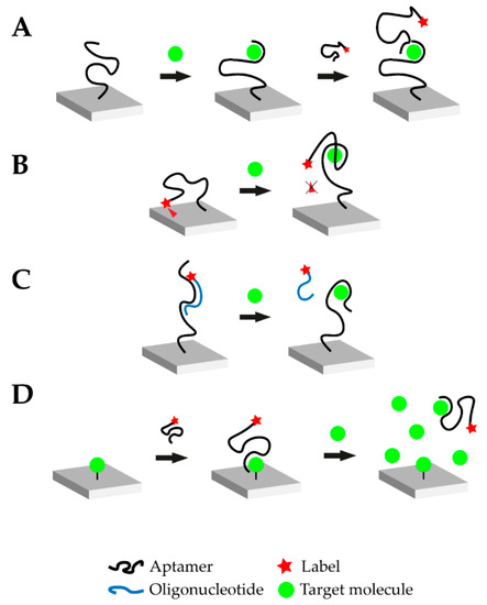 Similar to the concept of enzyme-linked immunosorbent (ELISA) assays, sandwich-like detection methods have been established for aptamers. The oligonucleotide is immobilized on a surface and binds its target, where a second aptamer binds a different binding site of the target to form a “sandwich” structure (Figure 1A). This mode can be realized with two aptamers directed against different epitopes of the target or in mixed approaches using an aptamer and an antibody. Therefore, it is possible to create aptamer-target-antibody hybrids. Such hybrid-systems were successfully demonstrated to detect cardiovascular biomarkers, such as troponin, but were not yet tested with small molecules [26,27]. The small molecule progesterone could also be detected in a sandwich-like lateral flow assay with a final LOD of 5 nM using gold-immobilized aptamers [28]. Small molecules do not offer many structural recognition elements which consequently limit the applicability of the sandwich-like strategy. Moreover, due to the small size of the target, steric hinderance between the two binding aptamers is likely to happen. Yet, it should be noted that when antibodies are employed this difficulty may intensify due to their larger size and limited flexibility when binding epitopes.