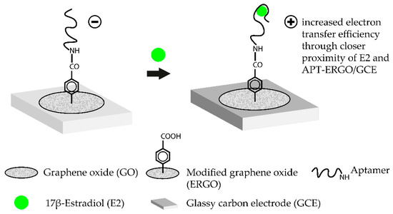 Working principle of a label-free aptasensor for the femtomolar detection of 17β-estradiol (E2) using graphene oxide as an amplification platform. To immobilize the estradiol-binding aptamer, a series of previous chemical modifications are necessary. Firstly, a glassy carbon electrode (GCE) is modified with a graphene oxide (GO) layer. The GO diazonium salts are then electrochemically reduced which leads to the ERGO/GCE hybrid surface. The COOH-groups on the ERGO surface are then conjugated with NH2-modified E2-aptamers via carbodiimide formation. Addition of the target molecule E2 leads to the formation of the E2-aptamer complex. In the complex, E2 is brought closer to the ERGO/GCE surface which leads to an increased electron transfer efficiency. Transduction is then carried out by measuring the change in current by using square wave voltammetry. The aptasensor operates in the TISS mode. (Adapted from [45]).