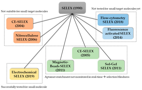 Overview of the reported SELEX methods used for the selection of new aptamers grouped based on their properties regarding applicability in small molecule selection and operational modes.