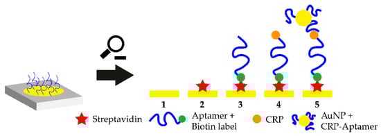 Close-up of the working principle of the smartphone-assisted sensor platform. Streptavidin is immobilized on a gold coated surface and the biotinylated CRP-aptamer is added. Biotin binds to the immobilized streptavidin and the aptamer binds to circulating CRP. Then, aptamer-modified gold nanoparticles (AuNPs) are added which bind to a different epitope on the CRP molecule. The shift in the surface plasmon resonance (SPR) wavelength is monitored with a smartphone-assisted device and CRP concentration can be measured.