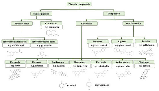 Several criteria, such as activity, solubility, size, kinetics and occurrence, are used to classify antioxidants [23]. The classification and schematic representation of phenolic compounds is shown in Figure 1.