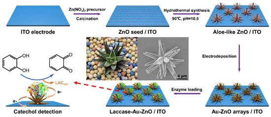 Due to the increased catalytic properties of gold, Liu et al. [49] developed aloe-like Au–ZnO micro/nanoarrays for the detection of catechol. A lot of effort was put into the growth of the aloe-like Au–ZnO arrays on an ITO electrode, and this process is illustrated in Figure 2. Zinc oxide (ZnO) was chosen since it is a well-known semiconducting material on which enzymes can easily adsorb. ZnO/ITO was prepared through a modified wet chemical process, after which the aloe-like ZnO was coated with adsorbed Zn2+; followed by the electrodeposition of gold from a HAuCl4 electrolyte solution.