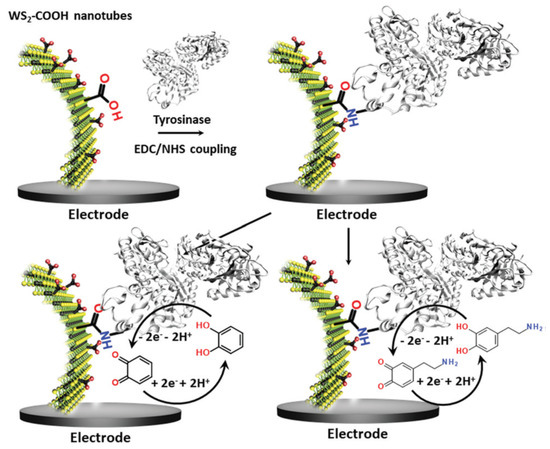 A very interesting and less encountered nanoparticle type was used and functionalized by Palomar et al. [50]. The authors used tungsten disulfide nanotubes (WS2) functionalized with carboxylic acid functions (WS2-COOH). The carboxylic acid groups served as an anchor for the immobilization of Tyr from mushroom via a standard EDC/NHS coupling reaction. The electrochemical behaviour of the WS2-COOH films on GCEs was monitored using CV in organic media, where the irreversible oxidation of WS2 is shown. The WS2-COOH nanotube films with a controlled thickness of 6.2 µm, were then used as a support for the immobilization of tyrosinase, as shown in Figure 3.