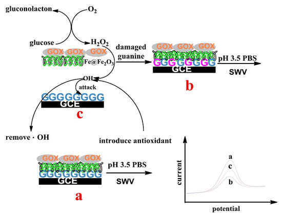 DNA-based biosensors use DNA as a recognition element, and their performance is assessed based on the principle of oxidative damage inflicted on the DNA by ROS/RNS. By adding an antioxidant to the solution, the oxidative damage should decrease, indirectly evaluating the antioxidant capacity of the analysed phenolic compounds [51]. Either single- or double-stranded DNA can be immobilized on the electrode surface, or one of the amino acids can be used. Wang et al. [52] chose guanine to be added in a composite membrane, as shown in Figure 4.