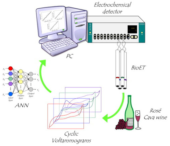Another voltametric BioET was described by Ceto et al. [59], comprising an array of four enzyme-modified (bio)sensors. The electrodes were prepared by mixing resin with its corresponding hardener in a ratio of 20:3 (w/w), then adding 15% (w/w) graphite and 2% (w/w) modifier (either Tyr, Lac or copper NPs); after which the mixture was homogenized and left to dry. One electrode was kept as a blank, without any modifier. The electrochemical cell was formed by the four (bio)sensors as a working electrode array, with a double junction Ag/AgCl reference and a platinum counter electrode. The obtained data were further processed with various chemometric tools, including PCA. Since the (bio)sensor array had been already successfully used in the resolution of phenolic compound mixtures in wine samples, the authors proceeded to directly analyse 20 varieties of wine, by recording a complete voltammogram with each sensor for each sample. The working principle of the BioET is presented in a schematic approach in Figure 5.