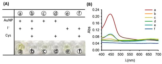(A) Color changes of the solution under different conditions. The “+” indicates the presence of the corresponding substance. (B) Absorption spectra of the catalytic AuNP solution under different conditions. The final concentrations of I− and cysteine were 5 μM and 50 μM, respectively.