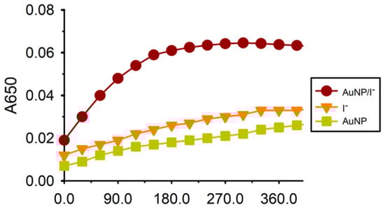 In addition, to verify that the synergy of I−/AuNP improved the peroxidase-like activity, I−, AuNP, and I−/AuNP were tested before the addition of a stop solution. As the result shows in Figure 2, when the AuNP and I− coexisted in the reaction solution, the absorbance at 650 nm increased rapidly with time. The absorbance was linear in the initial 120 s, so 120 s was selected as the initial rate period. Thus, the I−-modified AuNP had the fastest rate of 2.3 × 10−4/s for TMB oxidation, 3.5- and 3.9-fold higher than that of the I- alone (6.7 × 10−5/s) and citrate-capped AuNP nanozyme (6.0 × 10−5/s), respectively, indicating I− enhanced the activity of the AuNP.