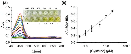 The sensitivity of our system was determined in the presence of different concentrations of cysteine. To this end, assays were performed on the inhibition of I− attachment to the surface of AuNPs by cysteine molecules in solution. It is worth noting that in the absence of cysteine, the I− ions in the solution are directly absorbed onto the interface of the AuNPs, resulting in a significant change in the catalytic ability of the nanoparticles. The absorbance intensity of this assay at 450 nm was found to decrease, and the color of the solution gradually changed from yellow to colorless with an increasing cysteine concentration (Figure 3A). Under optimal conditions, a linear relationship was observed from 0.5 to 20 μM in a log scale. According to the 3σ/slope rule (σ shows the standard deviations of the blank sample, which is 0.0001 μM, while the slope is 0.448), the detection limit was determined to be 0.5 μM (Figure 3B). This low limit of detection was better than that obtained using fluorescence [51,52], electrochemical [53,54], or surface plasmonic detection [55,56] methods. The sensitivity of this strategy was lower than that of high-performance liquid chromatography (HPLC) [57,58], but the assay using this nanozyme was faster than HPLC analysis.