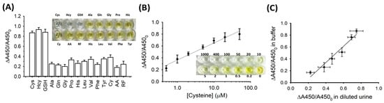 Urine samples were collected from healthy volunteers. Prior to spiking, the addition of acetonitrile was used for protein precipitation [45,46]. Thus, 100 μL of urine subsamples were mixed with 300 μL of acetonitrile and vortexed for 1 min. The samples were then centrifuged at 12,000 rpm for 30 min at 4 °C to remove the protein matrix. Forty microliters of the resulting supernatants was added to 360 μL of cysteine standard solution. The absorbance was measured at 450 nm and used to determine the concentration of cysteine in urine.