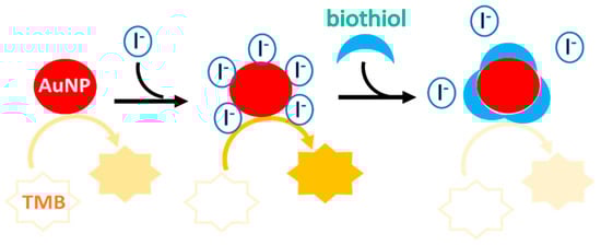 To address the limitation imposed by this low catalytic activity, Huang et al. developed an assay for the colorimetric detection of mercury ions (Hg2+) after finding that Hg2+ could improve the catalytic activity of citrate-capped AuNPs [39,40]. Shah et al. found that adenosine triphosphate (ATP) markedly induced catalytic activity in AuNPs, but did not yet use ATP as a sensor for other molecules [41]. In a previous study, we found that iodide ions (I−) served as an etchant of two-dimensional gold nanotriangles for the sensing of antibiotics [42]. In the present study, I− showed potential for use as an activity promoter to expand the peroxidase-like activity of AuNPs. We also found that the interfacial properties of AuNPs could be reversibly switched in response to biological stimuli. This behavior makes AuNPs an attractive candidate for establishing label-free colorimetric sensors. In this study, catalytic iodide-capped AuNPs were used as signal reporters to convert the binding reaction into a colorimetric response. The sensing principle is illustrated in Scheme 1. I− ions are known to readily attach to the surface of gold through the chemisorption of iodide [43]. Thus, the catalytic ability of AuNPs was enhanced once I− became attached to the surface of AuNPs via Au–I linkages. Conversely, upon the addition of biothiol molecules (cysteine as the model), I− became displaced from the AuNP surfaces due to the Au–S bond being stronger than the Au–I linkage [44], resulting in the loss of the peroxidase-like activity of AuNPs. As the thiol group has a higher capability to gold, the approach developed in this work is, therefore, suitable for the identification of biothiol molecules.