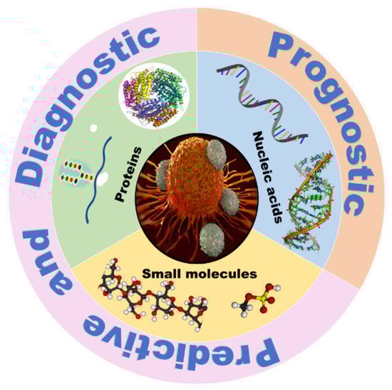 Cancer progression is marked by abnormal cell division, followed by the expression of specific molecules (biomarkers) that are otherwise absent or typically expressed in small amounts in healthy cells [,,,]. A biomarker is an indicator of a person’s health, disease condition, or responses to therapy and collective of a broad range of biomolecules from proteins, glycoproteins, nucleic acids to a variety of other small molecules found in bodily fluids [,,,,,,]. Nucleic acids such as DNA and RNA mainly act as prognostic biomarkers providing a risk assessment of cancer [,], whereas protein biomarkers serve as diagnostic/predictive biomarkers of cancer, to provide a quick picture of the patient’s health [,,]. The most accurate way to use these tools is to measure multiple biomarkers for each type of risk, or in the case type of cancer (Figure 1). Thus, the majority of cancer biomarker research focuses on protein detection for early diagnosis, post-surgery reoccurrence, and cancer staging [,].