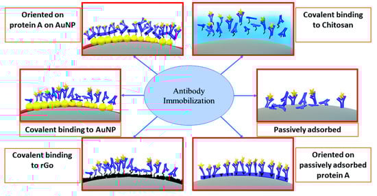 Layer-by-layer (LBL) techniques have gained popularity in biosensor fabrication, following its introduction by Lvov and Decher in the early 1990s, and have been used frequently for the attachment of Ab1 on printed electrodes [,,,] (Scheme 1B). Carbon electrode surfaces carry a net negative charge in neutral solutions, and metal electrodes can be derivatized with anionic thiols, like mercapto-propionic acid, to give them a negative charge at pH < 6 []. Hence these negative surfaces can be layered with adsorbed polycations such as polyethyleneimine (PEI), poly(diallyldimethylammonium chloride) (PDDA), or poly(allylamine hydrochloride) (PAH) [] (Scheme 1B). Then, the negatively charged nanomaterials can be adsorbed as the next layer (see Section 3.1 for use of nanomaterials in surface modification of electrodes) (Scheme 1C), followed with Ab1 immobilization, commonly through amidization [] (Scheme 1D,E). Sharafeldin et al. further discussed different strategies of Ab1 immobilization on screen-printed carbon electrodes (SPCEs), such as (a) electrochemical adsorption of glutathione-coated gold nanoparticles (GSH-AuNP); (b) electrochemical deposition of graphene; (c) passive adsorption of antibodies directly to the carbon surface through the Fc region, with Fab region orientated towards the antigen-binding; (d) passive adsorption with random orientation; (e) chitosan films; and (f) covalent bonding of antibodies to GSH-AuNP. According to their study, sensitivity of the sensor mainly depends on the active area and antibody coverage enhanced by nanostructures (discussed later in detail), whereas a greater degree of orientation will extend the linear dynamic range to higher concentrations but not lower detection limits [] (Figure 2).