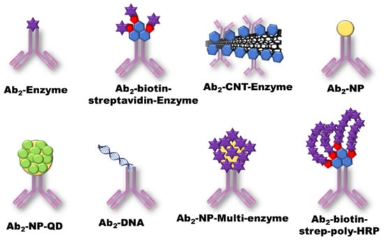 The signal amplification provided through the enzyme label alone is not sufficient to reach the ultra-sensitivities required for many clinical cancer biomarker diagnoses. Thus, additional amplification strategies have to be adopted on the printed electrode systems [,,,,]. Approaches include (a) redox cycling by using reversible redox couples regenerated electrochemically, chemically, or enzymatically (discussed in detail by Yang et al.) []; (b) multiple labeling such as multi-enzyme nanoparticles or polymers that provide a manifold of electrochemical events per bound analyte []. Other approaches include secondary antibody tags with dissolvable nanoparticles and multi-enzyme Ab2 conjugates (Figure 3) [,,,,].