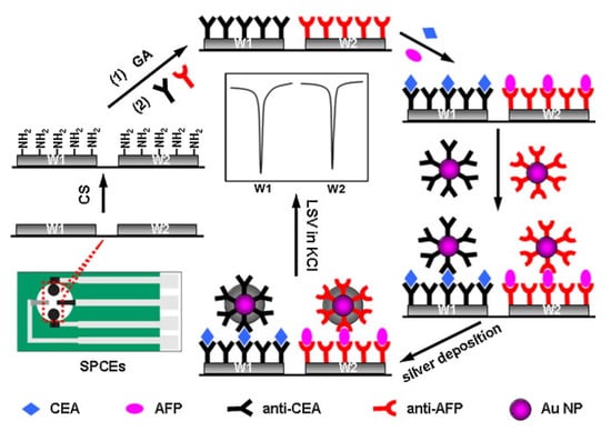 Pioneering work on metal NPs on SPEs was done by Dequaire et al. using colloidal gold particles tagged with Ab2, following acid digestion and detection of the produced Au (III) particles via anodic stripping voltammetry (ASV) detecting immunoglobulin G (IgG) at μg mL−1 LODs []. Following, Joe Wang and his team did ground-breaking research on metal NPs for protein detection during the 2000s, including cyclic accumulation of gold nanoparticles to catalyze the precipitation of silver [,,,]. AuNPs were used by Lai at el. with a less destructive mode for multiplexed detection of α-fetoprotein (AFP) and carcinoembryonic antigen (CEA) with 3.9 and 3.5 pg mL−1 LODs, respectively. After immobilization of Ab1 on the electrode surface using chitosan linking, electrodes were incubated with AFP and CEA, followed by secondary antibodies anti-AFP and anti-CEA conjugated with AuNP tags. Next, silver nanoparticles (AgNPs) solution was deposited on the SPE and the Ag reduction was detected by linear sweep voltammetry (LVS) from −0.15 to 0.25 V at 50 mV s−1 in 1.0 M KCl solution [] (Figure 4). Following this, a variety of NPs were used for protein biomarker detection, including silver NPS [,,], platinum NPs [,,,], palladium NPs [,], copper NPs [], and iridium NPs [,].
