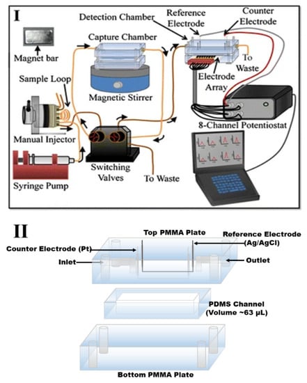 The microfluidic set-up used by our group in electroimmunosensors. (I) Schematic diagram of the pump (used for the flow of wash buffers and hydroquinone mediator into the detection chamber), HPLC injector (used for the injection of the sample into the detection chamber), switching valve (for alternation of the direction of fluids into the detection chamber, capture chamber or the waste), microfluidic chamber (houses the electrodes and the detection chamber), and the eight-channel multipotentionstat for amperometric detection of the analytes. (II) The microfluidic chamber with a poly (dimethoxy) silane channel (1.5 mm × 2.8 cm) sandwiched between two hard poly (methylmetacrylate) (PMMA) plates. The upper PMMA plate houses the platinum counter electrode and the Ag/AgCl reference electrode. Reprinted with permission from [], copyright 2015 Springer Nature.