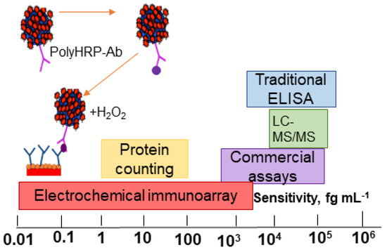 Comparison of the sensitivity of the new electrochemical immunoassay with poly-HRP and AuNP-modified carbon electrodes developed by Dhanapala et al. with other protein detection methods currently available. Reprinted with permission from [], copyright 2020 American Chemical Society.