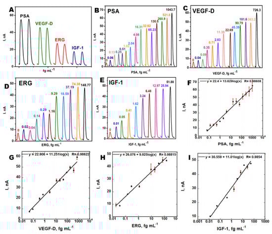 Calibration plots obtained with (A) duplicate amperometric peaks of PSA, VEGF-D, ERG, and IGF-1 showing reproducibility; (B–E) show amperometric peaks obtained for each biomarker standard; and (F–I) show the calibration plots with dynamic ranges from 0.013 to 1000 fg mL−1. Reprinted with permission from [], copyright 2020 American Chemical Society.