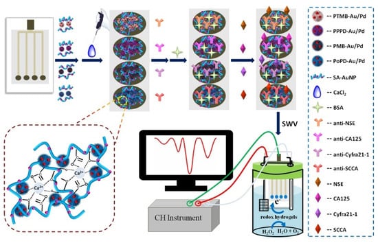 Zhao et al. developed a system with multiple working electrodes on a SPCE, each for specific target analytes coated with four different hydrogels activated by sodium alginate-Au nanoparticle (SA-AuNP) composites. They detected four proteins—CA-125, neuron-specific enolase (NSE), fragment antigen 21-1 (Cyfra21-1), and squamous cell carcinoma antigen (SCCA) at 0.0054 U mL−1, 2.3 pg mL−1, 5.5 pg mL−1, and 4.8 pg mL−1, respectively, using amperometric detection [] (Figure 9). Many other works, in label-free protein detection, have attained clinically-relevant detection limits, but they have only detected single biomarkers and improvements are required for multiplexing [,,,].