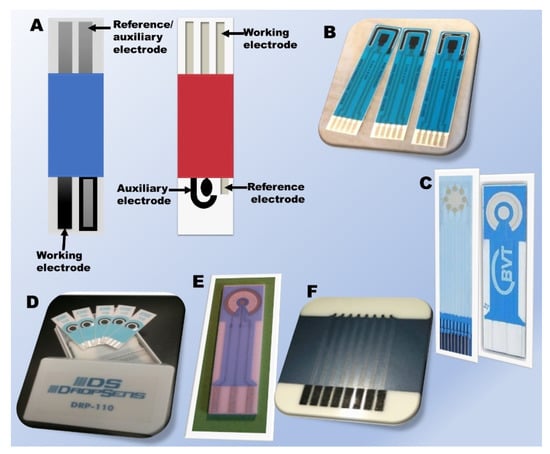 Screen-printed electrodes that are commercially available. (A) schematic diagram of generation one (left) and two (right) SPEs. (B) SPE from Pine Research including a carbon working electrode, a carbon counter electrode, and an Ag/AgCl reference electrode []. (C) left—AC9C Sensor array with graphite working electrode and Ag/AgCl reference electrode, right—AC1 Sensor with graphite working and auxiliary electrodes and Ag/AgCl Reference Electrode from BASi []. (D) metrohm SPE based on carbon, gold, platinum, silver, or carbon nanotube inks []. (E) PalmSens electrodes with same material working and counter electrodes (C, Pot, Ag, Au or Au-Pt alloy) and reference electrode made from Ag or Ag/AgCl [] and (F) SPCE from Kanichi Research Services Ltd. housing eight working electrodes [].