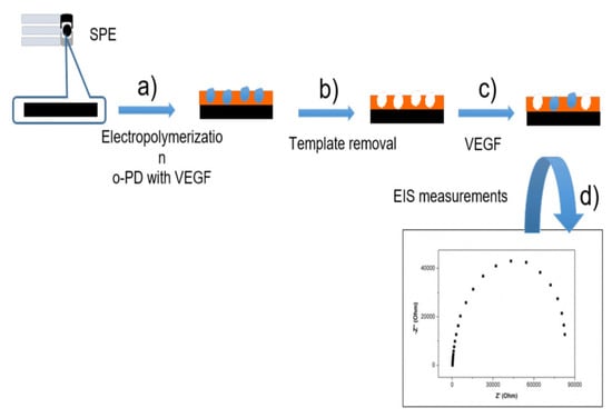 SPEs have also served as the base for a molecular imprinted sensor []. Molecular imprinting involves developing affinity polymers for target analytes. The template or target analyte interacts during polymerization on the surface to form a polymerized binding site on the surface of SPE. Once the template is removed, it leaves the binding sites free for the subsequent capture of the imprinted analyte []. Bozal-Palabiyik et al. developed a molecularly-imprinted polymer on the surface of a SPE for cancer biomarker VEGF []. They used label-free impedance to detect VEGF with a dynamic range from 20 to 200 pg mL−1 and a limit of detection of 0.08 pg mL−1 [] (Figure 11). Gomes et al. developed an electropolymerized SPE with amine-substituted benzene rings as monomers and specifically charged monomers for creating protein imprinting materials for breast cancer biomarker CA 15-3 []. The commercial Au SPE from DropSens consists of gold working and auxiliary electrodes, and reference and electrical contacts made of silver. Using this sensor, Gomes et al. demonstrated a linear dynamic range of 0.25 to 20.00 U mL−1, with detection limit of 0.05 U mL−1, for CA 15-3, from square wave voltammograms in diluted serum, with only 15 min incubation between sensor and solution of CA-15-3 [].