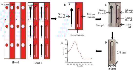 The fabrication of the paper-based electrodes by Fan et al. (A) Sheet I and II indicate the screen-printed wax patterns. Paper A and B of Sheet I contain the sample zone (5.00 mm) and the auxiliary zone (6.00 mm), which were designed for the carbon counter, working, and Ag/AgCl reference electrodes. Sheet II contains Paper A and B with patterns for the above three electrodes. (B) Represent a full screen-printed electrode system with all the three electrodes: counter, working, and reference. (C) A photograph of the produced electrode system with a silver pad. (D) Folded electrode. (E) A typical signal from the DPV used for the detection of the immunosensor. Reprinted with permission from [], copyright 2019 Elsevier B.V.