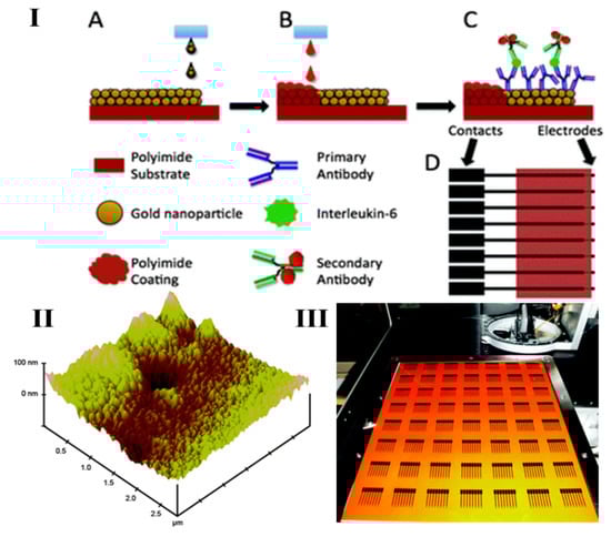 The inkjet-printed electrode immunoassay. (I) Schematic diagram of the immunoassay procedure indicating (A) AuNP inkjet printing on to the Kapton polyimide substrate, (B) insulation with poly(amic) acid, (C) immunoassay build-up, and (D) the electrode surface with AuNP patterns in black and insulating poly(amic acid) patterns in orange. (II) Tapping mode Atomic Force Microscopy (AFM) image of the AuNP working electrode surface. (III) A total of 56 eight-electrode arrays printed on a Kapton surface by Dimatix Materials Printer. Reprinted with permission from [], copyright 2012 The Royal Society of Chemistry.