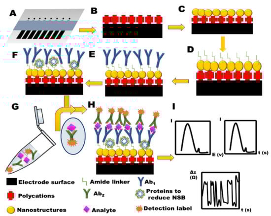 Representation of the general protocol followed (A–I) during an electrochemical immunoassay. (A) A typical screen-printed carbon electrode, (B) Surface modification by LBL where polycations are coated on the electrode surface, (C) Equipping the surface with nanostructures, (D) Amidization reaction with surface functional group via linkers such as EDC 1-(3-(Dimethylamino)propyl)-3-ethyl carbodiimide hydrochloride (EDC) and N-hydroxysulfosuccinimide (NHSS) [], (E) Ab1 immobilization followed by incubation, (F) Reduction of NSB by washing with detergents and BSA or casein proteins, (G) Introduction of a signal generating labeled Ab2 for detection of analyte, (H) Final arrangement of Ab1, Ag and Ab2 to give a sandwich type ELISA, (I) Electrochemical detection through voltammetry, amperometry, or impedance.