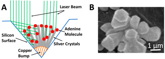 Figure 1A is a schematic diagram of multi-directional laser illumination of silver crystals on a copper bump inside a silicon hole. Figure 1B shows an SEM image of elongated silver crystals grown on a curved copper bump forming nanoscale gaps between crystals suitable for laser induced plasmonic coupling effects for SERS applications. As shown in Figure 1A, a laser beam aiming at the cluster of silver crystals results in multi-directional illumination of adenine molecules adsorbing on silver. The orientation in which an adenine molecule adsorbs on silver varies depending on the interactive mechanism between adenine and silver. Polarization and orientation of laser illumination thus cause the SERS spectra of adenine to vary, too. With silicon surface surrounding the silver cluster serving as mirrors, silver crystals and adenine molecules on silver are subjected to multi-directional laser illumination. The most favorable combination of laser intensity and orientation of illumination generates the strongest SERS signal strength from a small amount of adenine molecules in areas with strong local electromagnetic fields. In the case of this SERS sensor, the strongest SERS signal strength originating from the ring breathing mode vibration of low-concentration adenine in aqueous solution is at 760 cm−1 when the SERS is under illumination by a green laser beam at 532 nm. This ring-breathing mode SERS peak of adenine shifts significantly from the original Raman peak of adenine at 721–726 cm−1 and SERS peak around 745 to 760 cm−1 depending on the adenine concentration and other conditions of measurements.