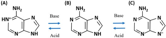 Examples of molecular structures of (B) neutral adenine, (A) positively charged adenine in alkaline, and (C) negatively charged adenine in acid.
