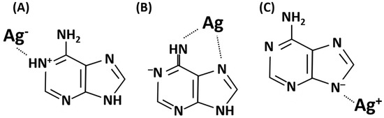 Schematic diagrams of adenine adsorption on silver. (A,C) Electrostatic interactions of adenine with silver and (B) interactions by functional groups of adenine molecules with silver.