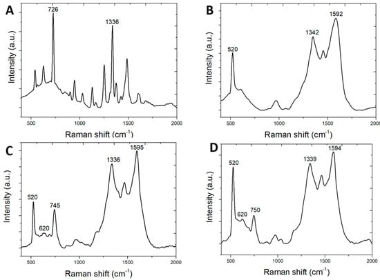 A Horiba Scientific Raman system with a green laser at 532 nm and laser power at 450 mW is used to measure Raman spectra. The laser beam is focused on the sensor surface in an area of about 10 µm in size. SERS spectra are measured in several different areas on each sensor for each concentration of adenine water solution. The concentration of adenine is considered to be above the low detection limit if the ring-breathing mode SERS peak around 760 cm−1, which is characteristic of adenine molecules [], this is clearly distinguishable from the background signal. The low detection limit is determined by the lowest concentration of adenine solution, which produces a clearly detectable adenine SERS scattering peak. Multiple sensors are characterized to confirm the reproducibility.