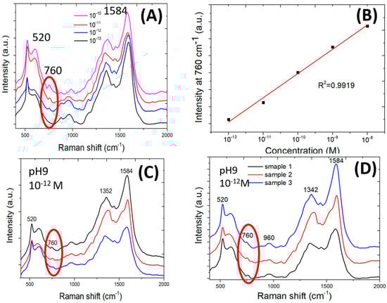 Figure 5A shows the Raman spectra of adenine of 10−10–10−13 M concentration in a pH 9 water solution. The adenine ring-breathing peak shifts with its adsorption orientation on silver and its interactions with silver surface [,]. The ring-breathing mode SERS peak for low-concentration adenine in water is measured to be around 760 cm−1. The SERS peak at 760 cm−1 which is circled in red indicates that adenine in a water solution with pH 9 has been detected at as low concentration as 10−12 M. The 760 cm−1 peak is not detectable from the SERS spectrum measured from 10−13 M adenine. The SERS signal strength at 760 cm−1 is plotted as a function of the adenine concentration and shown in Figure 5B. Figure 5C shows that the 760 cm−1 SERS peak is detected by all SERS spectra measured at three different surface areas on the same sensor using a pH 9 water solution of 10−12 M adenine. Figure 5D shows that the same low detection limit is reproducible by three different sensors.