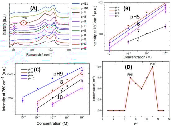 (A) SERS spectra measured for 10−12 M adenine water solution of different pH values. (B,C) Adenine SERS signal intensity as a function of adenine concentration and pH value. (D) Low detection limit of adenine concentration by the SERS sensor in study in water solution of different pH values.