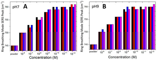 Bar charts of four SERS sensors (displayed in different colors) exhibiting a similar trend of shift of the ring-breathing mode SERS peaks of adenine. Measured SERS peaks of adenine powder on the sensor are also included for comparison. (A) pH 7 and (B) pH 9 aqueous solution.