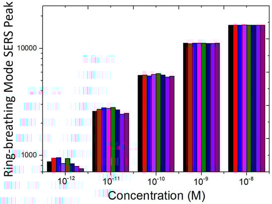 Figure 8 displays the measured signal strength of the ring-breathing mode SERS peak from pH 9 adenine aqueous solution. Eight SERS sensors are used to measure the signal strength. Measured results from each sensor is shown in different colors. It should be noted that although the combined bar chart looks linear, if one focuses on just one color, for example, purple color in the bar chart of Figure 8, it would be clear that it does not represent a linear trend. The combined eight parallel bar charts in one graph visually misleads one to feel that it is linear. It is shown that the reproducibility is excellent for measuring 10−9 M and higher-concentration adenine aqueous solution. The fluctuation in measured SERS signal strength for lower-concentration adenine aqueous solution is due to the small amount of adenine molecules on the SERS sensor. Non-uniform distribution of a small amount of adenine molecules adsorbing at different parts of a sensor with varied strength of local electromagnetic fields and in varied orientations with respect to the silver surface is attributed to the increasing fluctuation. Nevertheless, all eight SERS sensors exhibit the low detection limit of 10−12 M adenine aqueous solution at pH 9. For applications, which allow the variation of the pH value, the low detection limit of the SERS sensor can be improved further beyond the very low detection limit of 10−11 M adenine in neutral aqueous solution by ten times and reaching 10−12 M at pH 9 and between 10−11 M and 10−12 M at pH 5.
