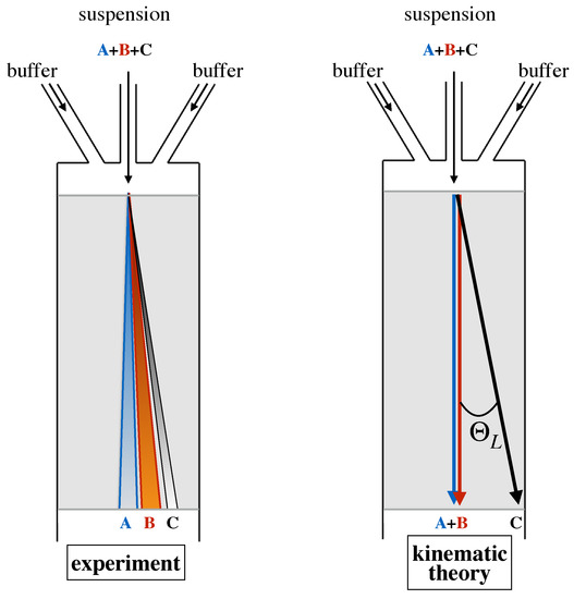 Note that, within this simplified modeling approach, all particles whose radius is smaller than the critical radius travel along a single trajectory characterized by zero deflection angle, whereas particles of radius larger than travel along a single trajectory characterized by a deflection angle . It is also worth observing that, so long as the flow is in the creeping flow regime, this feature is independent of the flowrate of the buffer solution. The left panel of Figure 2 depicts the qualitative features that are typically observed in the real world separation process. Here, particles of each given size scatter about a median trajectory, whose direction continuously depends on the specific particle size. A detailed account of the phenomenology of particle transport is described in the next section. Here, we just highlight that this phenomenology must be accounted for in theoretical models of particle dynamics that are meant to provide a design framework for specific applications of the DLD separation technique.