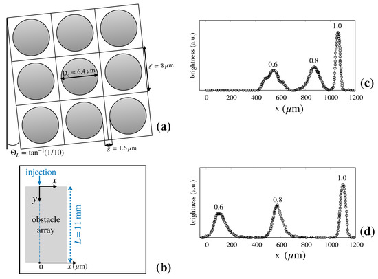 The tilting angle was here was set equal to , which gives rise to a Stokes flow characterized by ten adjacent lanes in the elementary cell (details are given in Section 2.2 below). In [6] fluorescent particles of different diameters ( were continuously introduced in a narrow focused stream (ideally of vanishing thickness) upstream the obstacle lattice. Long-Time exposure micrographs were taken at the device cross-section downstream the entrance. From these images, the brightness as a function of the cross-sectional coordinate, x, was measured (Figure 3b). At steady-state, the fluorescence intensity signal at a given position between x and is thus proportional to the number of particles that exit the device at this interval per unit time. (c) and (d) of Figure 3 depict the brightness measurements for a flowrate equal to and , respectively. The data clearly show that, at both flowrates, the suspension of particle is well separated at the device exit. In addition, the following observations can be made based on these data: