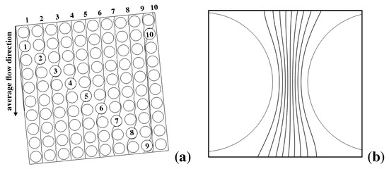 Kinematic structure of the pressure-driven Stokes flow in Huang’s prototype. (a) critical streamlines associated with selected obstacles (numbered from 1 to 10) in a area of the lattice; note that each streamline enter and leaves the area at the same horizontal coordinate, its average direction being parallel to the channel walls (collinear with the average flow direction); (b) structure of the flux tubes (lanes) associated with critical streamlines in the restricted gap between adjacent obstacles.