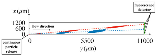 Owing to the stochastic character of Equation (2), physically meaningful features of particle dynamics can be defined only in a statistical sense, i.e., by considering averages over a large number of independent realizations of the stochastic process. Figure 5 shows the instantaneous positions of particles of two different sizes (red ; blue ) that were released at the origin of the coordinate system for a statistically significant number of realizations (order ) of the stochastic process in Huang’s device [6] for a flowrate of .